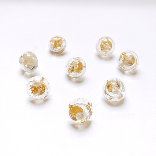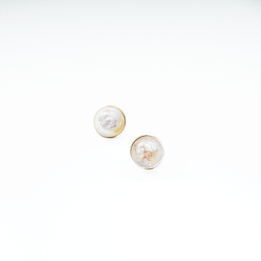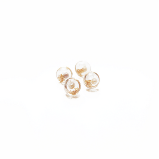 Circle Resin Art Earring with white pearl, gold stones and dry flower, 14k gold filled